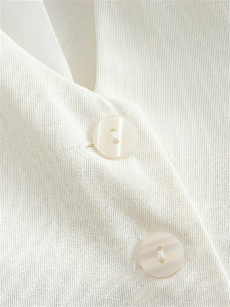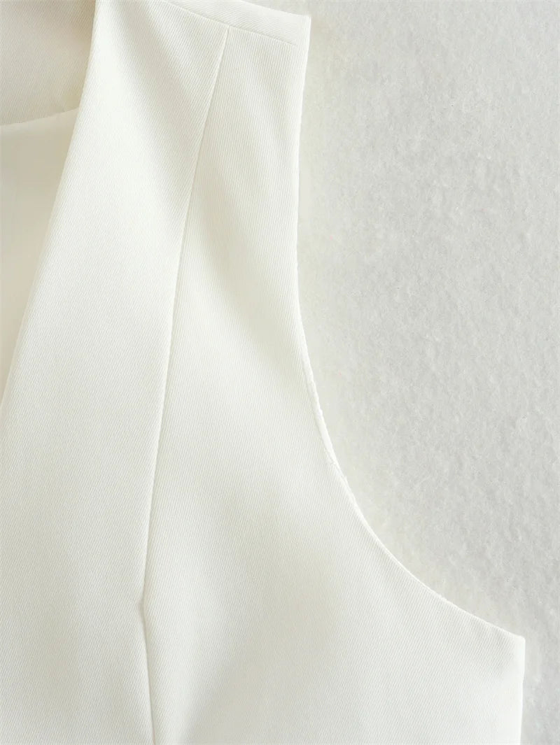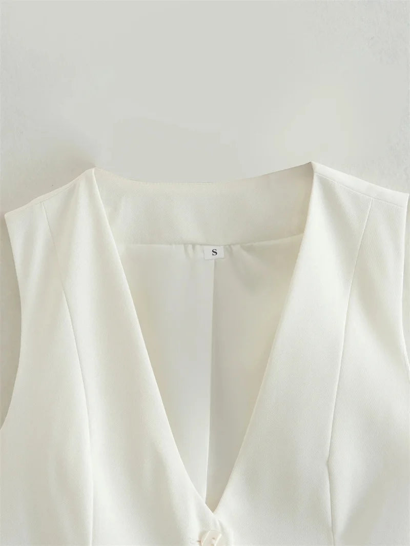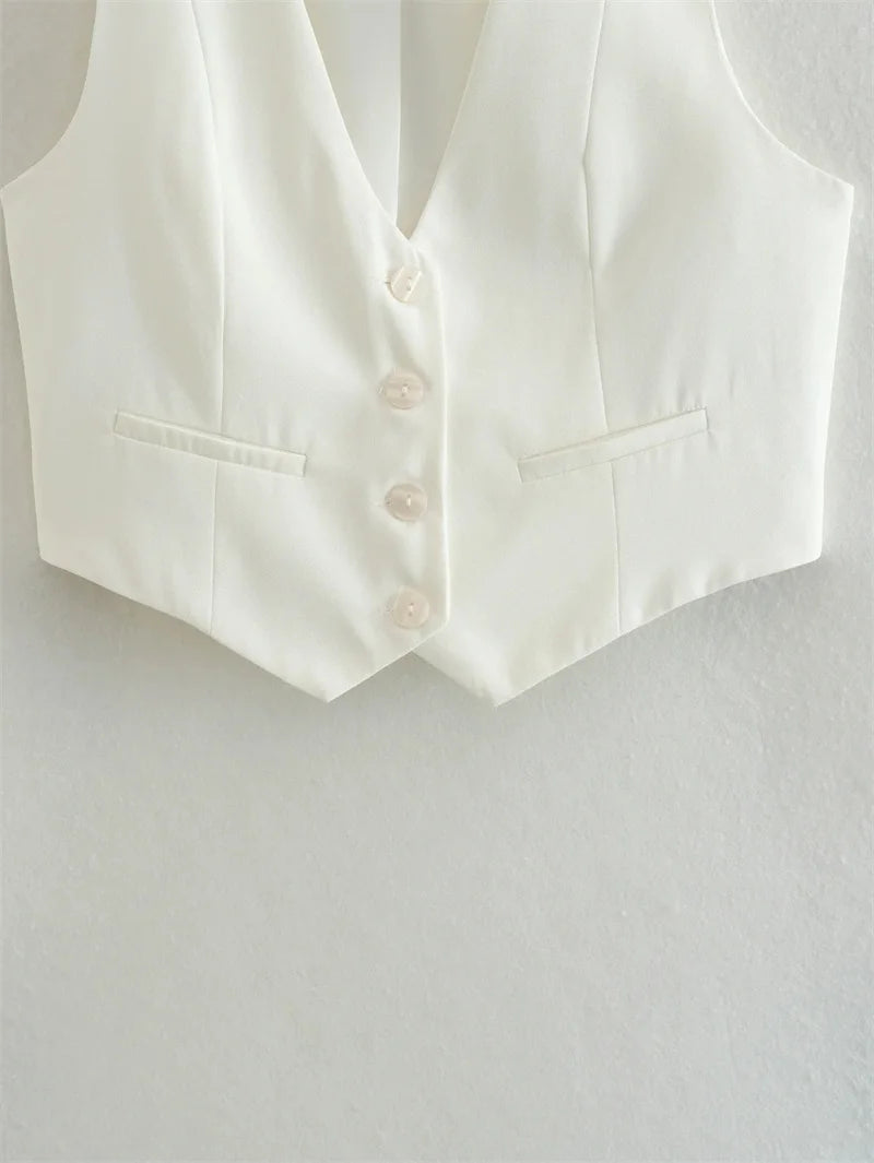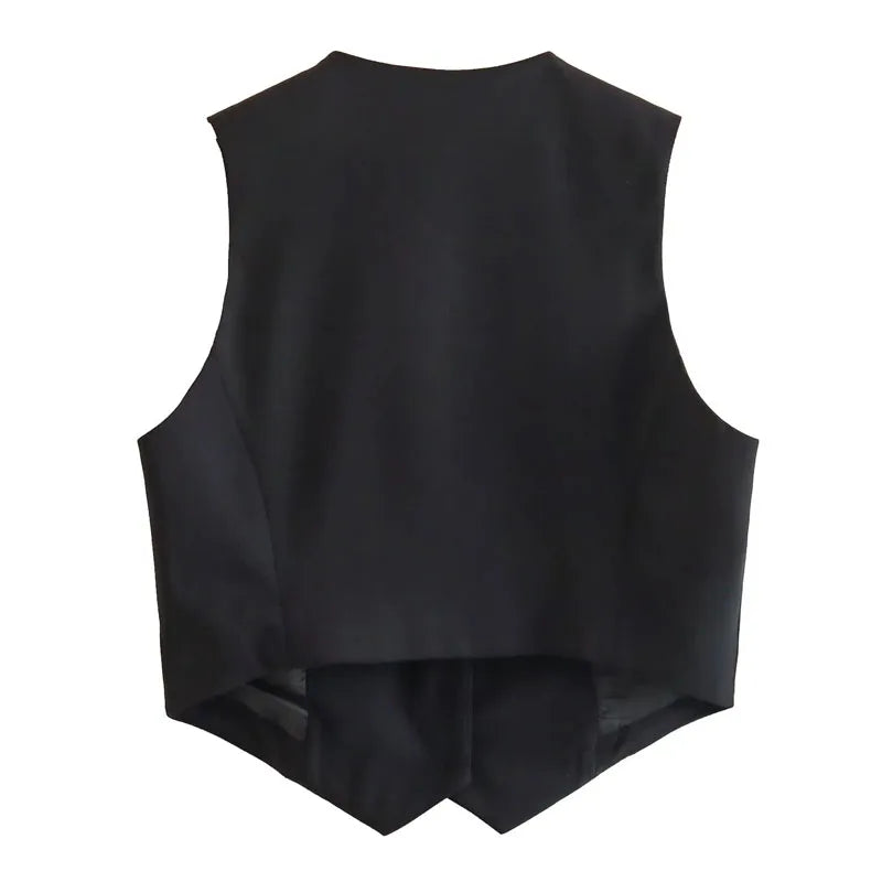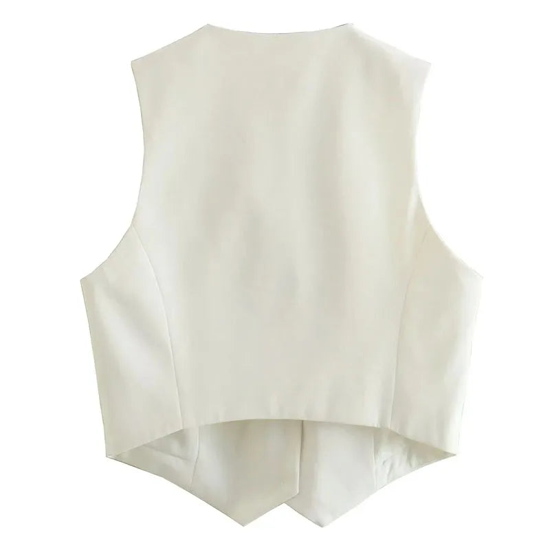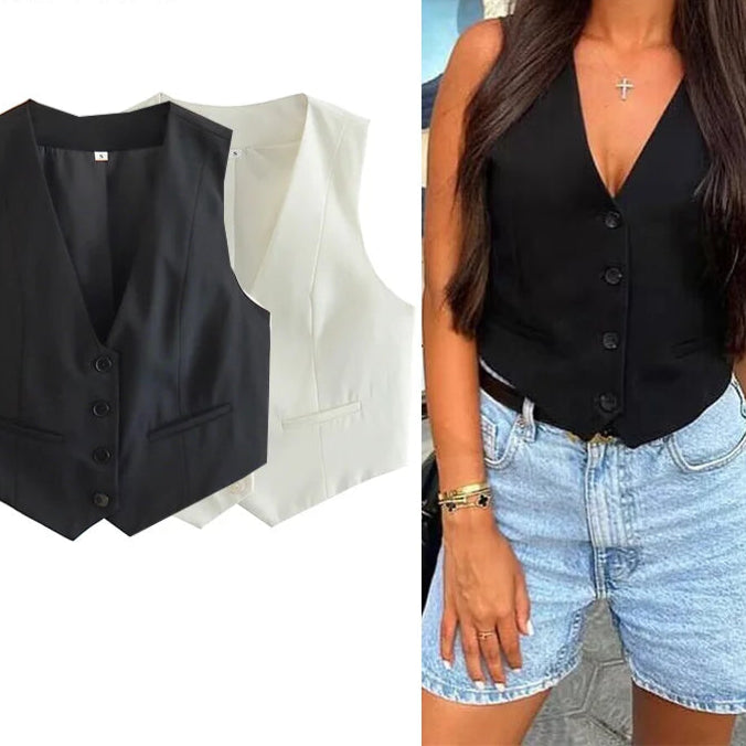 Ce gilet court sans manches est bien plus qu’un haut d'été — c’est une déclaration de style. Avec sa coupe tailleur revisitée, son décolleté en V structuré, et ses lignes nettes, il apporte une touche chic et assurée à vos tenues estivales.